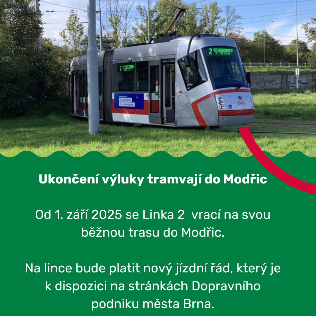 Od 1. září 2025 se Linka 2 vrací na svou běžnou trasu do Modřic. Na lince bude platit nový jízdní řád, který je k dispozici na stránkách Dopravního podniku města Brna.
